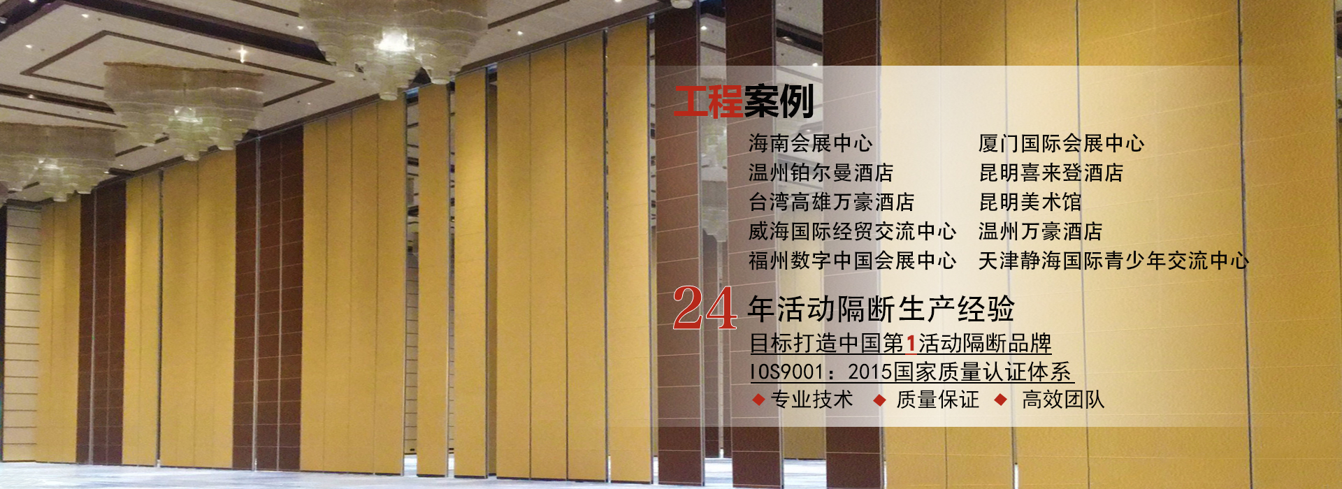 廣東一固隔斷制品有限公司成立于1998年,國家高新技術(shù)企業(yè),位于中國佛山市南海區(qū)里水鎮(zhèn),是一家專業(yè)從事活動(dòng)隔斷和辦公室玻璃隔斷系統(tǒng)開發(fā),銷售,生產(chǎn)和售后服務(wù)的一站式生產(chǎn)廠商。公司產(chǎn)品廣泛應(yīng)用于星級飯店,寫字樓,餐廳,宴會(huì)廳,會(huì)議中心或會(huì)展中心等商業(yè)場合,提供便捷有效的空間管理解決方案。最高門板高度可達(dá)20米,最大隔音系數(shù)可達(dá)56分貝。 一固公司擁有兩個(gè)現(xiàn)代化的生產(chǎn)基地,占地超過10,000平方米,...